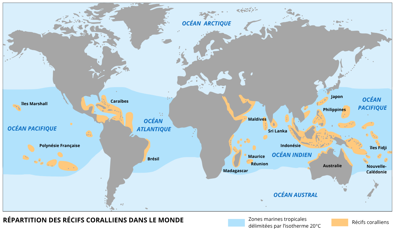 Les récifs coralliens couvrent une surface relativement restreinte des océans, mais ils se concentrent dans la ceinture tropicale, entre 30°N et 30°S. L’Indonésie, l’Australie et les Philippines abritent les plus vastes ensembles coralliens, suivis par la France grâce à ses territoires d’outre-mer, notamment la Nouvelle-Calédonie dont la barrière corallienne s’étend sur plus de 1 600 km. La plus grande structure actuelle demeure la Grande Barrière de Corail en Australie, longue de 2 600 km.