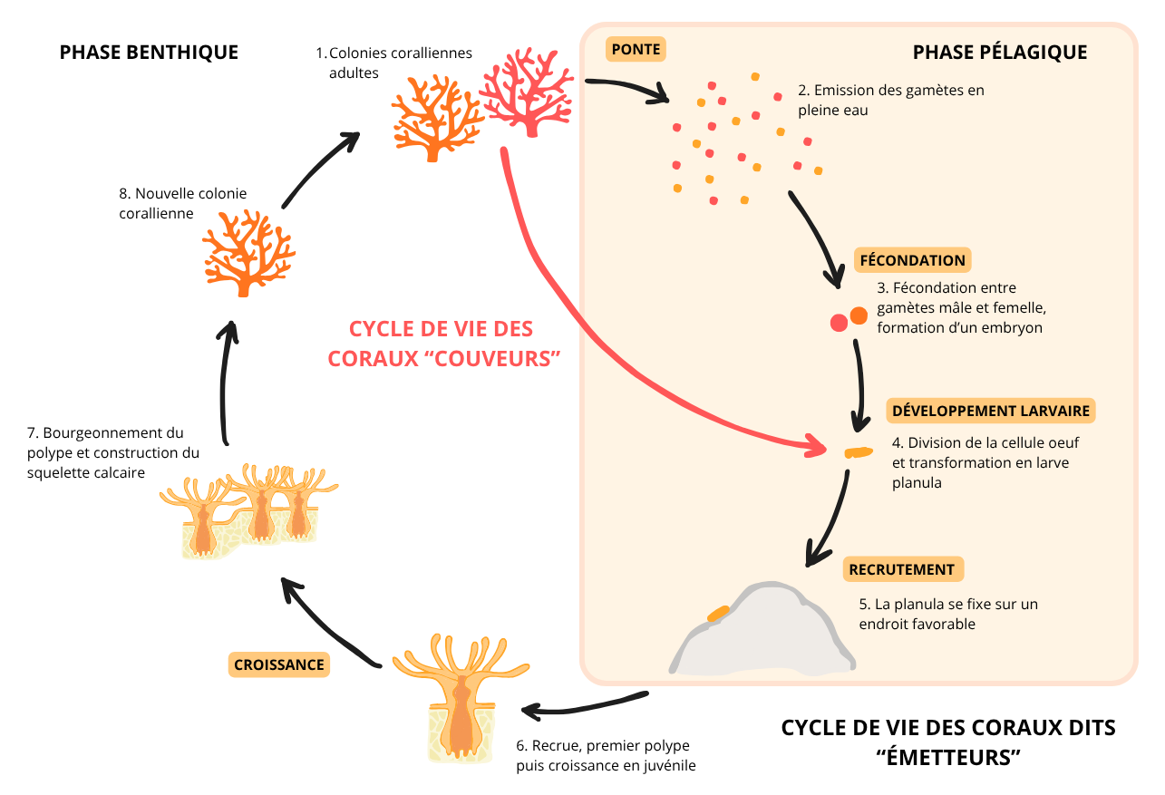 L’alternance entre reproduction sexuée et asexuée, ainsi que la succession des phases pélagique et benthique, assurent à la fois la dispersion, la diversité génétique et la résilience écologique des coraux.