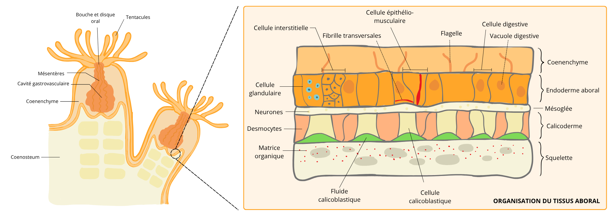 Chez les coraux scléractiniaires, l’ectoderme de la partie basale contient des cellules spécialisée, appelées calicoblastes, qui sécrètent le squelette calcaire de l’animal.